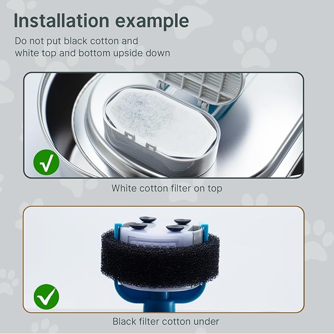 - 【Replacement and Use】Change the cat fountain filter every 2 to 4 weeks or more often to keep the water fresh and clean. Please Note: To prevent activated carbon dust from falling into the water, soak the filter for 5 minutes before use.