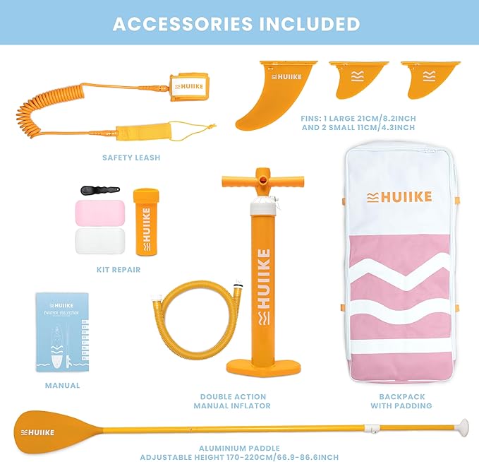 - All the accessories you need - The “Enjoyer - Essential” collection include everything necessary to practise paddleboarding: pink stand up paddle board, backpack, safety leash, pump, aluminum paddle, 3 fins, repair kit and manual