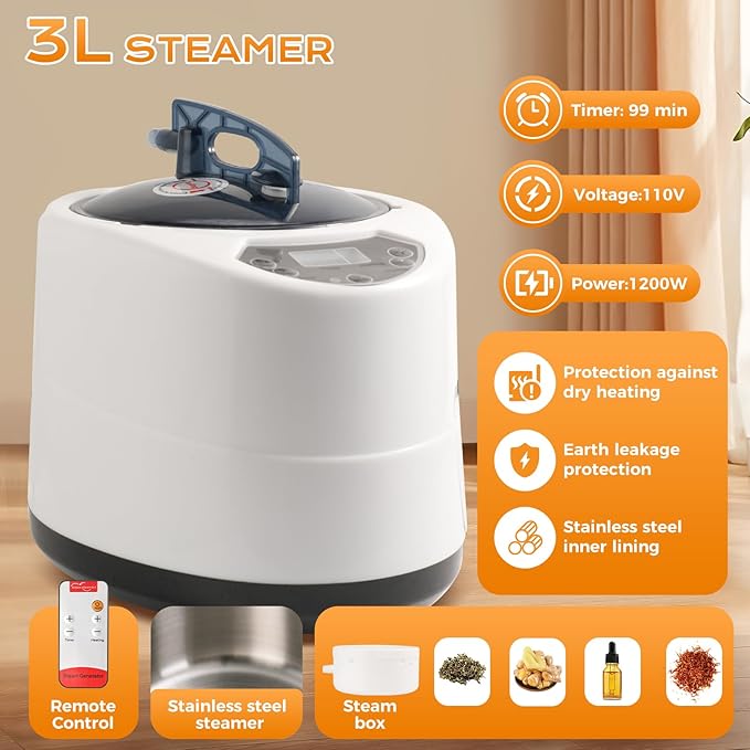 - 3L Sauna Steamer:The interior of the steamer is made of high quality 304 stainless steel ,1-99 minutes timer , 9 levels of temperature adjustment, customisable temperature and time settings for a better sauna experience according to preference.1200w of high power , which can be quickly to fill the sauna with heat. With anti-dry burning and explosion-proof functions., automatic power-off protection function to ensure the safety of use.