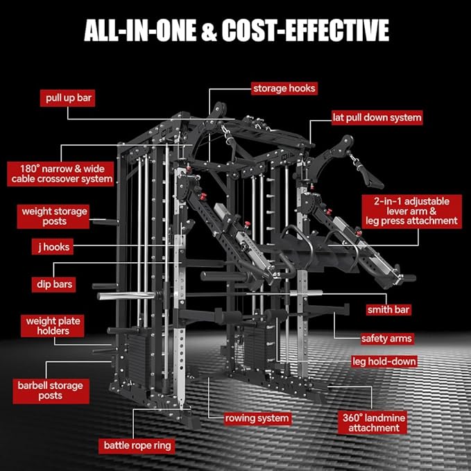 - All in One Power Cage Home Gym Station: This home gym workout station is multi-functional with full body training attachments which is perfect for home and commercial gym. This all in one power cage comes with functions of power rack, narrow and wide cable crossover, smithe machine, lat pull down, dipping, vertical leg press, lever arm, pull up, seated row, chin up, battle rope, landmine, leg raise and so on. You are able to perform full body training workouts in a limited space.