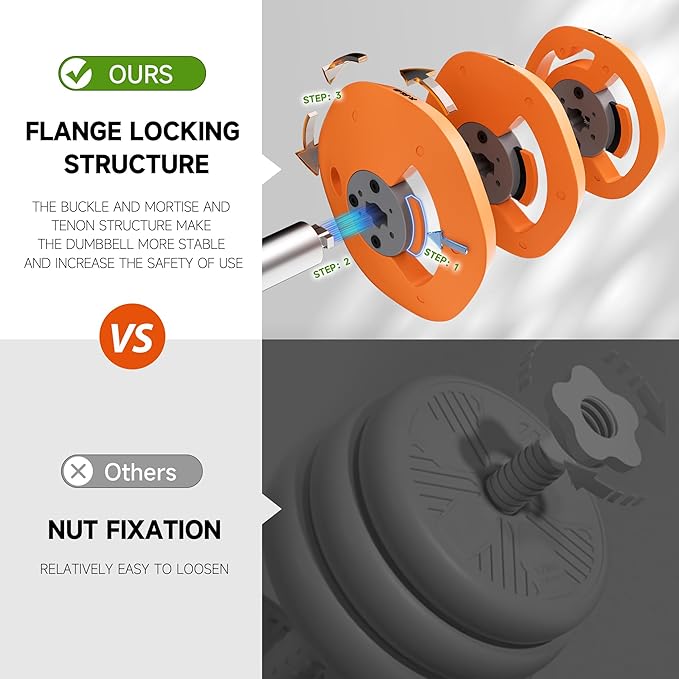 - ๐ฅใStable Locking Structureใ: Featuring a flange disk lock system, our adjustable dumbbell ensures a secure and stable workout experience, eliminating the risk of weight plates falling off during use.