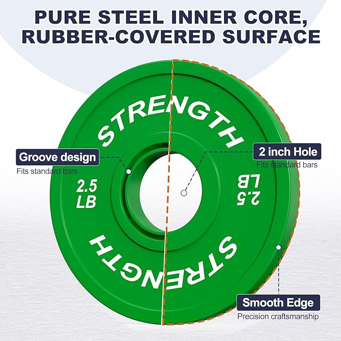 - Weight specification: Weight Precision +/-1% ; 1.25LB(White): 5.43 inch diameter/ 0.55 inch width; 2.5LB(Green): 6.06 inch/ 0.71 inch; 5.0LB(Blue): 6.48 inch / 0.71 inch; Fits All Standard 2" (50mm) Barbells