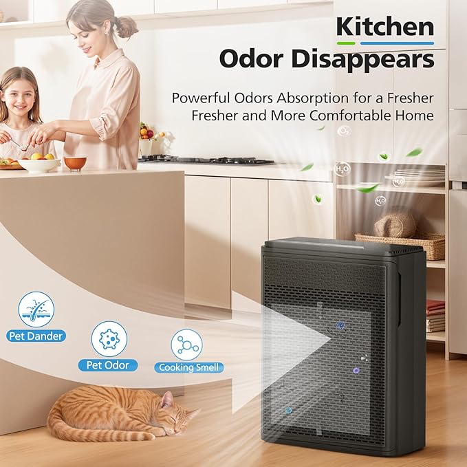 - ใPre-Filter & Activated Carbon FilterใThe fine preliminary filter attaches to large particles such as dust, lint, fibers, hair, pet fur and helping to extend the HEPA filterโs lifespan. The Upgraded high-efficiency activated carbon filter efficiently absorbs household odors and fumes from pets, cooking, smoke, wildfire and VOCโs.