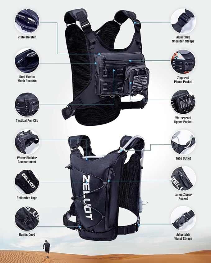 - Durable & Breathable - The front chest pack is made from waterproof and scratch-resistant 900D Oxford fabric, protecting your essentials from rain and sharp objects. The lightweight and breathable mesh backpack enhances air circulation and moisture-wicking. Reflective logo and strip on the front and back improve low-light visibility. This reflective running vest makes every run farther, safer, and more comfortable.