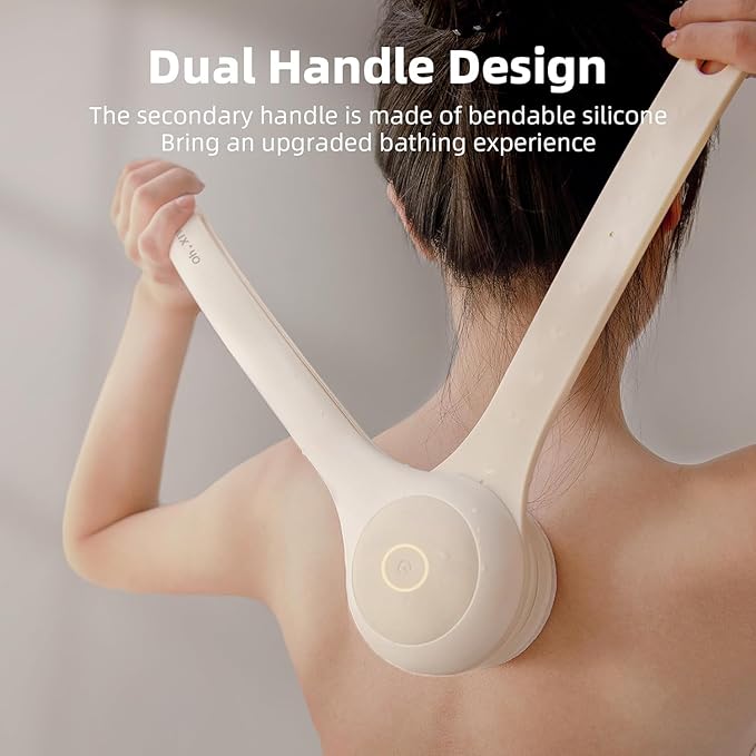 - Unique Dual-Handle Design: This electric body brush is designed with user-friendly double-length handle. The secondary handle is made of bendable silicone, can easily reach and clean your back and other body parts, pampering every inch of your skin, upgrading your bathing experience