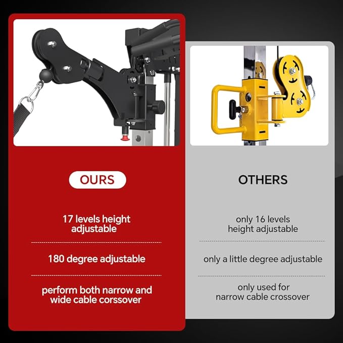 - 180° ROTATABLE CABLE CROSSOVER: Unlike others on the market, our cable crossover attachments on this machine adopts a specific patented design, which are 180 degree rotatable, allowing you to perform both narrow and wide cable crossover to build strength on different muscle groups. The 1:1 ratio lat pull down helps you to achieve a more efficient workout in daily strength training.