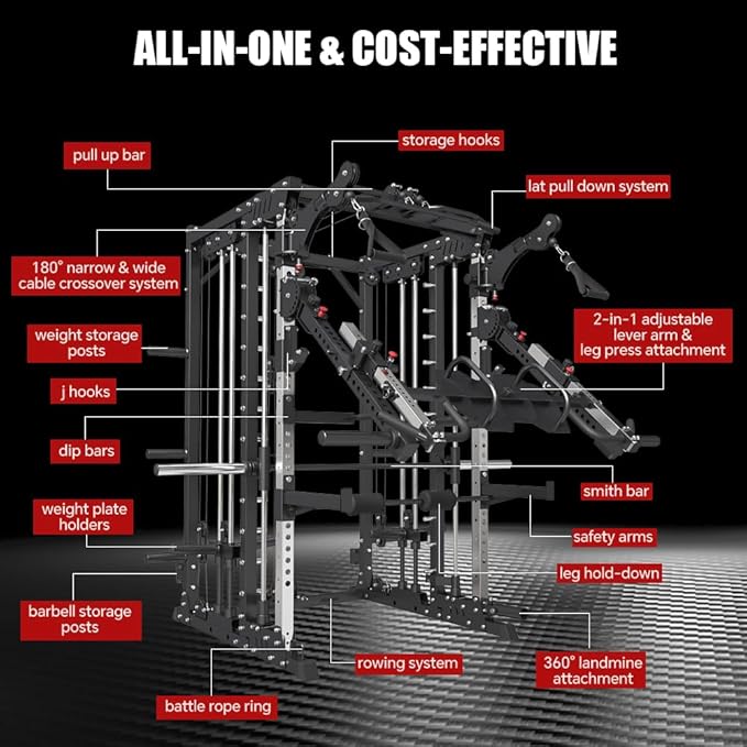 - ALL IN ONE POWER CAGE HOME GYM STATION: FAGUS H home gym workout station is multi-functional with full body training attachments which is perfect for home and commercial gym. This all in one power cage comes with functions of power rack, narrow and wide cable crossover, smith machine, lat pull down, dipping, vertical leg press, lever arm, pull up, seated row, chin up, battle rope, landmine, leg raise and so on. You are able to perform full body training workouts in a limited space.