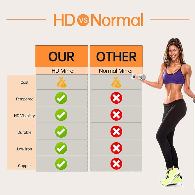 - HD CLEAR REFLECTION: This mirror is made of High Definition float glass for super clear reflection. Whether you're doing yoga, working out, or just checking your appearance, it can clearly reflect portraits and objects without any distortion, giving you the best view of yourself