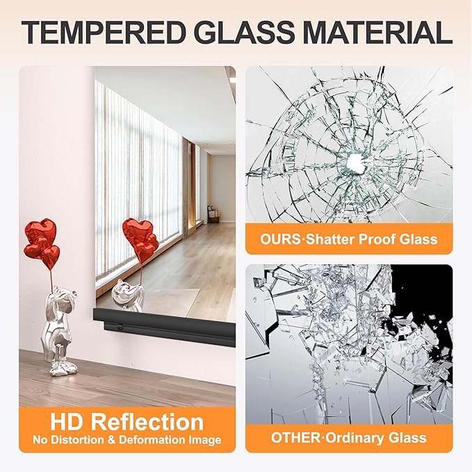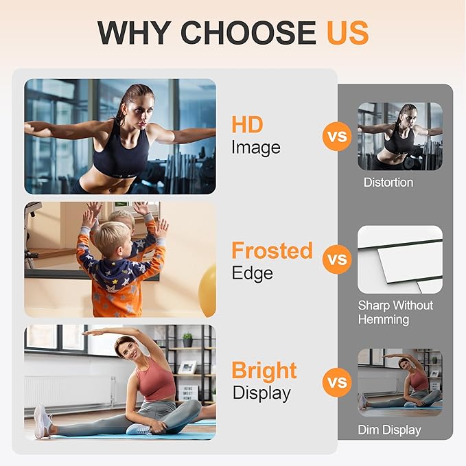 - HD CLEAR REFLECTION: This mirror is made of High Definition float glass for super clear reflection. Whether you're doing yoga, working out, or just checking your appearance, it can clearly reflect portraits and objects without any distortion, giving you the best view of yourself