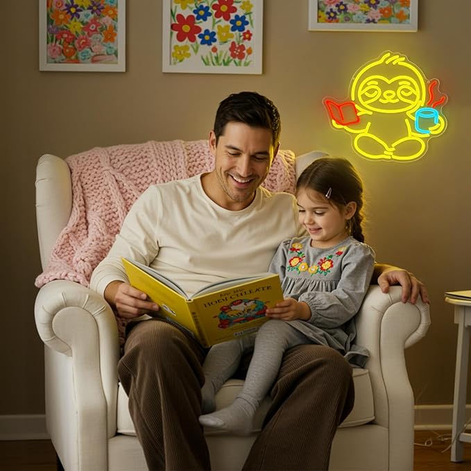 - Inspiring Reading & Chill Vibes This adorable sloth LED neon sign holds a book and a coffee mug – the perfect wall decor to promote relaxation, mindfulness, and reading culture in your space.