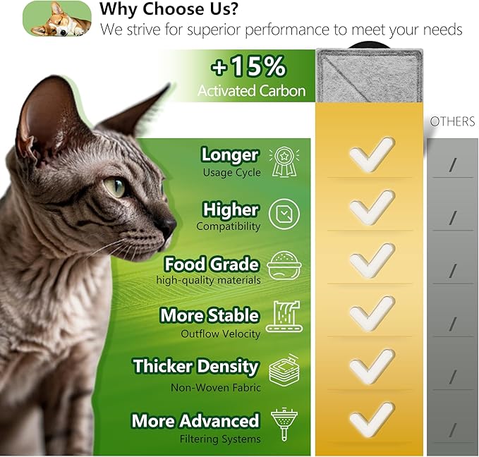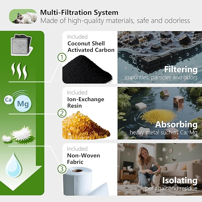 - Multiple Filtration: The cat filters for water fountain is filled with premium activated carbon, ion exchange resin and non-woven fabric, fully isolating cat hair and food residue, removing impurities and particles, filtering heavy metals and odors, softening tap water, and obtaining clean and fresh water