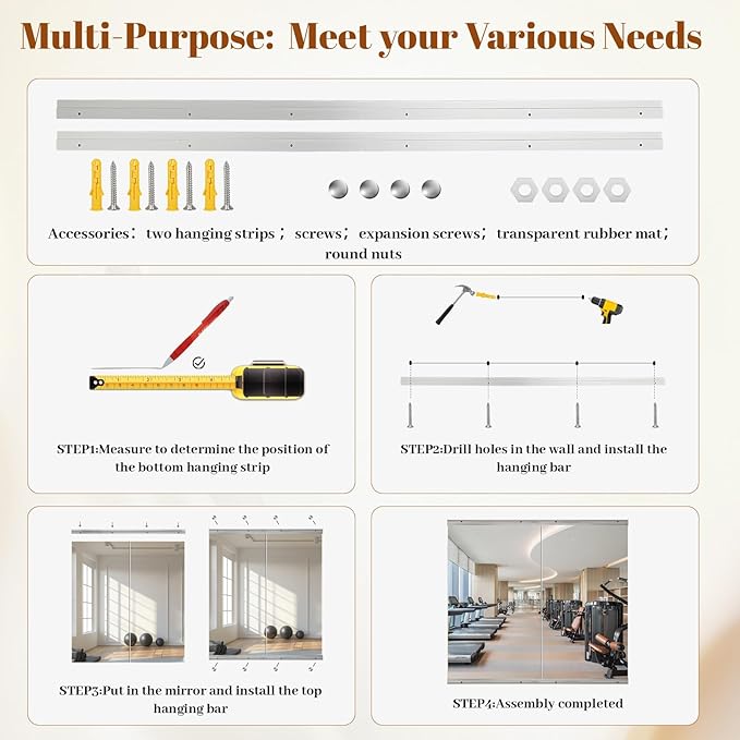 - Space-Saving Room-Brightening: Wall Mounted home gym mirror full length visually expand your home gym space while enhancing light. Perfect for garages, or basement gyms