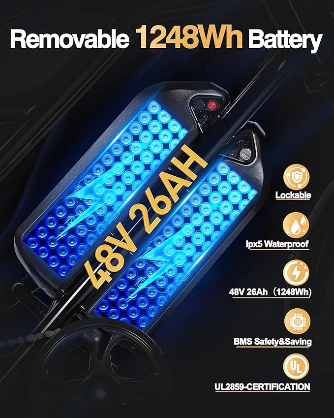 - Dual Detachable 48V 13Ah Batteries(1248Wh) - The UL2849-certified 48V 26Ah dual-battery system is easy to remove for charging, featuring a shockproof design for enhanced safety and extended range.