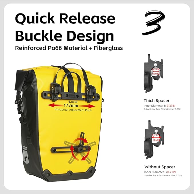 - Quick-Release Mount: Reinforced PA66+fiberglass buckles with 6.8in adjustable pitch, fits 0.4-0.7in racks