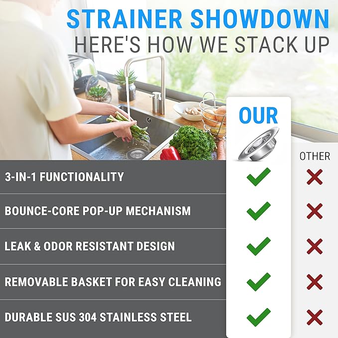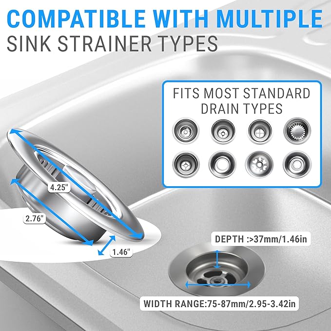 - 1. ๐๐ถ๐๐ฐ๐ต๐ฒ๐ป ๐ฆ๐ถ๐ป๐ธ ๐ฆ๐๐ฟ๐ฎ๐ถ๐ป๐ฒ๐ฟ: Prevents drain clogs by filtering food debris with an effective food catcher, reducing odors and buildup in both kitchen and bathroom sinks. Its practical design allows smooth water flow and is easy to clean and install โ ideal for homes and restaurants. The trusted solution to protect your sink from clogs.