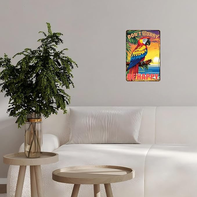Vintage Tin Sign Don't Worry Be Happy Tin Sign The Beach Parrot for Home Farm Outdoor Bathroom Restaurant Cafes Bars Club Kitchen Garage Cute Vintage Art Wall Decor 12 * 8inch
