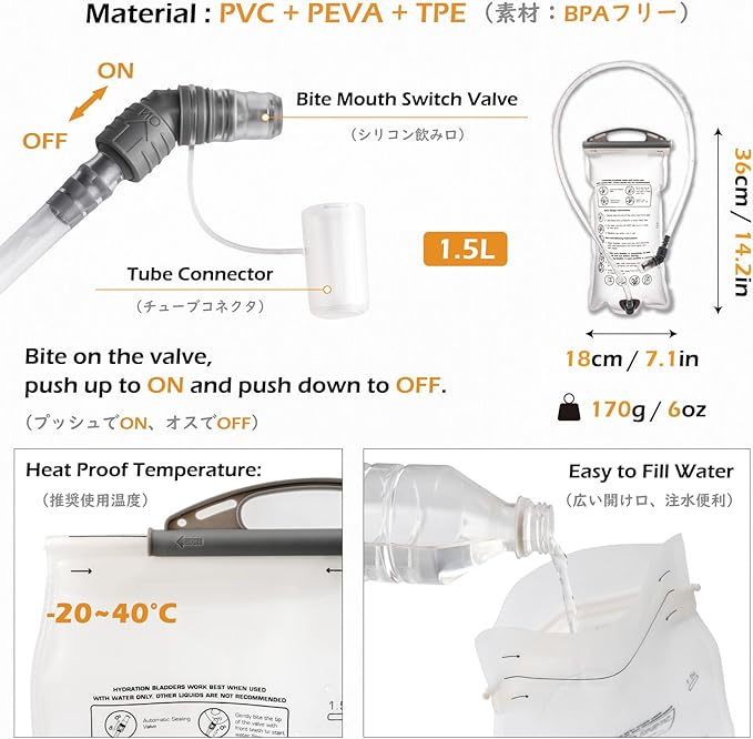- Water Supplement: 1.5L BPA-free water bladder equipped, pressure-tolerant and leak proof. Drinking water by the tube directly whenever you need without taking your running vest off or stopping your steps. Convenient trail running backpack outfit