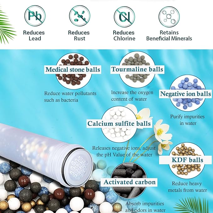 - Product Benefits : Reduces Chlorine, Fluoride, and Harmful Substances; Filters Out Sand, Rust, Heavy Metals, and Other Sediments; Enhances Bathing Experience Reduces Chlorine, Fluoride, and Harmful Substances; Filters Out Sand, Rust, Heavy Metals, and Other Sediments; Enhances Bathing Experience