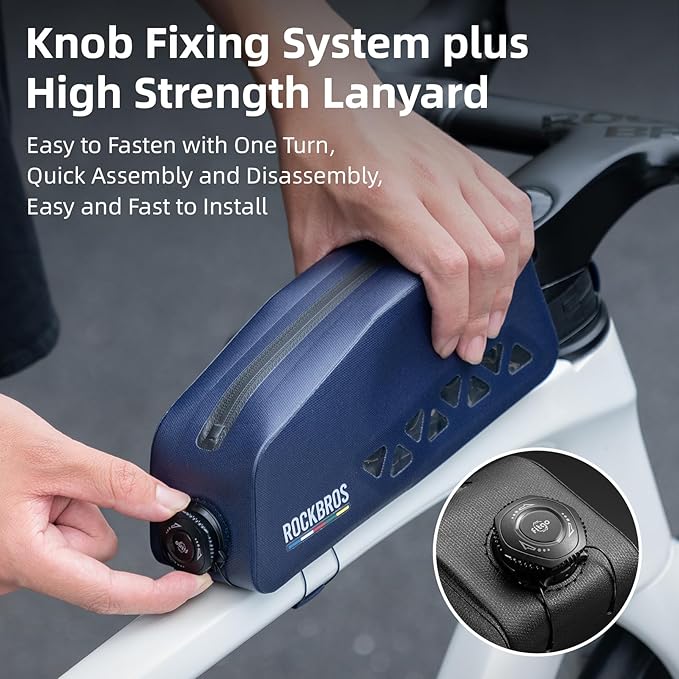 - Easy to Install: The ROCKBROS top tube bag adopts a self-developed innovative installation method, equipped with a sturdy and enduring knob and high-strength binding rope. Simply pull to release, wrap around, and press to tighten for quick, secure and firm fixing without looseness.