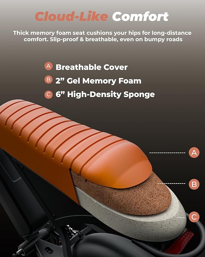 - Ride Smarter, Ride Safe-Ride in cloud-like comfort with EB5 Mini e-bike's innovative triple-layer wide seat design. Choose from 5 smart riding modes (PAS/Electric/Cruise/Walk/Pedal)and integrated USB charging, it delivers exceptional comfort and safety across all terrains.