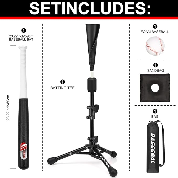 • 4.【ALL INCLUDED】This set comes complete with the Batting Tee, (1) 23 inch plastic bat,1 baseballs, and Sandbag (sand not included) by attaching it to base for extra stabilization if needed, providing you with everything you need to play!