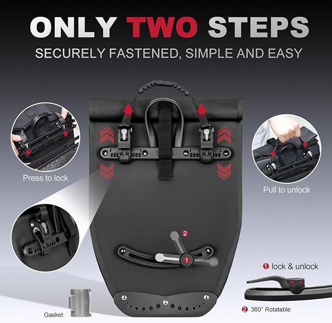 - 【Quick-Release Mounting System】Equipped with a three-point attachment and 360° rotatable buckle quick-release system, ensuring secure mounting and easy one-handed operation, compatible with most bicycle rear racks.
