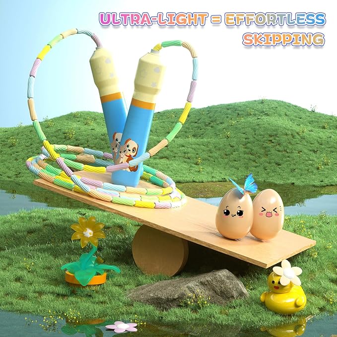 - 👦【Feel the Rhythm】Soft beaded makes that “tick tick” clicking sound on pavement or gym floors, helpful for developing kids jump rope rhythm. So jumping rope with this rhythm is perfect for outdoor, exercise, and fitness.