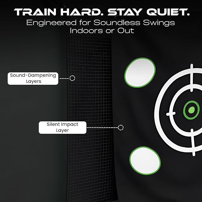 - Noise-Reducing Target Tarp – A custom multi-layer impact panel absorbs force and dampens sound, turning outdoor golf nets into a quieter, more focused practice zone with visual shot targets.