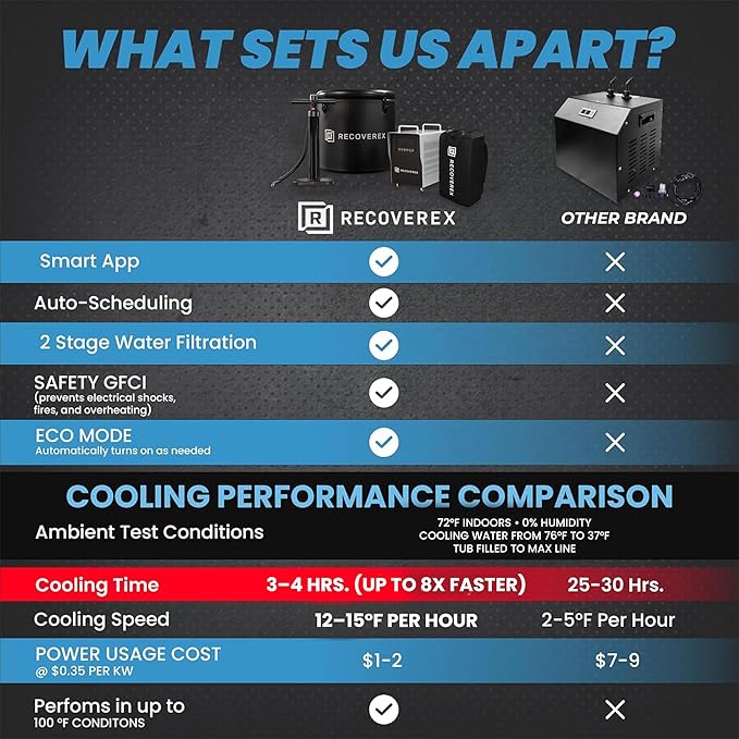 - SMART TEMPERATURE CONTROL – Maintain the perfect ice bath temperature remotely with this WiFi-enabled water chiller for cold plunge. Designed for AC100-130V, 60 Hz power sources, it delivers precise cooling for an optimal cold plunge experience. Using incompatible voltages may cause damage and void the warranty.