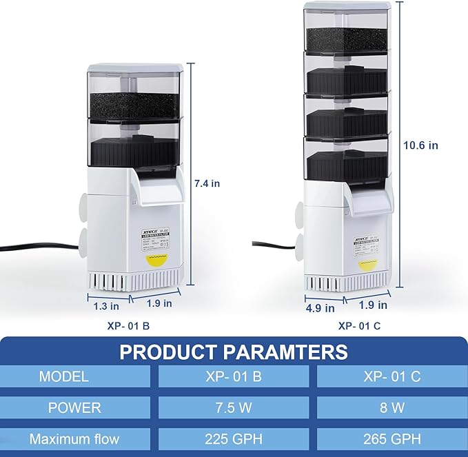 - 【Unique Design】Each layer of the fish filter can be removed individually and replaced with different filter media according to your needs. The waterfall-style water outlet can better promote water circulation and improve oxygenation efficiency. Strong suction cups on the bottom and sides can be firmly fixed in the aquarium.