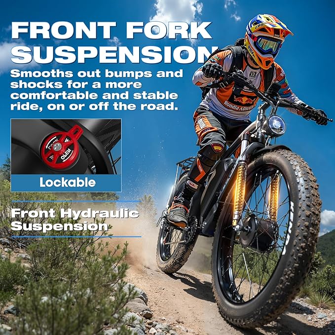 - Ride with Safety & Comfort – Stay in control with a hydraulic disc brake system and front lockable suspension that absorbs bumps for smooth handling. Whether city streets or dirt tracks, this electric mountain bike guarantees safer stops and a more comfortable ride.