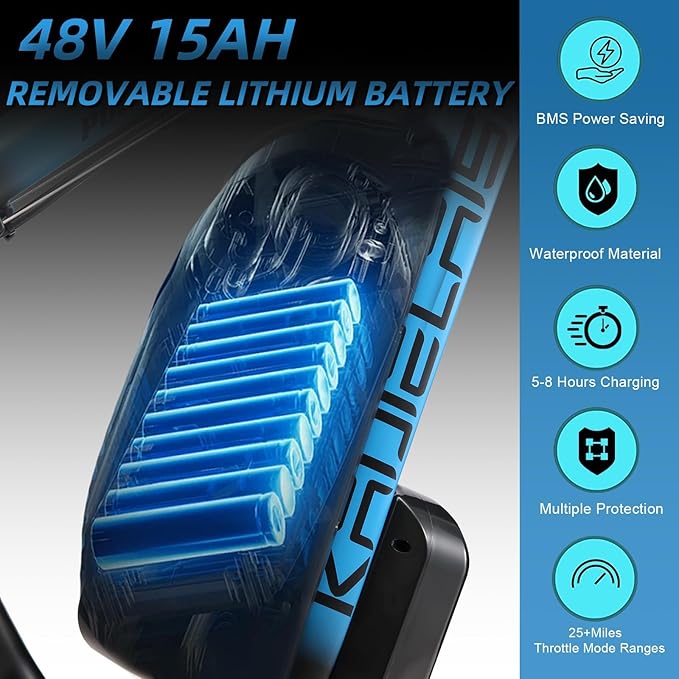 - 【48V 15Ah Removable Battery】-- this ebike has a 48V 15Ah rechargeable and removable lithium battery.It can provide a range of up to 50+ miles in PAS mode and 30+ miles in electric mode, so you don't need to worry about the power.Our electric bikes for adults is equipped with an 5-8 hour fast charging system and feature waterproof, lockable safety and anti-theft protection.