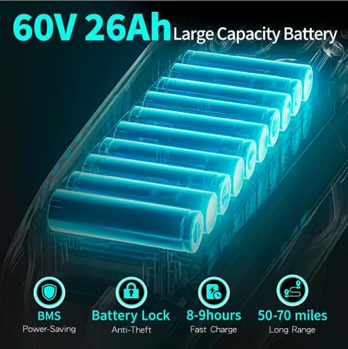- 60V 26Ah Battery: Powered by a 60V 26Ah battery, the e-bike offers an impressive 50-70 miles on a single charge. Equipped with a battery lock and 8-9hours fast charging. The waterproof removable battery allows you to install it while riding, reducing the risk of theft and ensuring long-lasting performance for all your adventures.