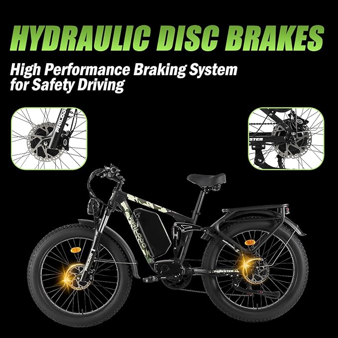 - Dual Motor System: The PHILODO Forester electric bike is equipped with dual motors delivering 5000W peak power (2x 2500W) and a massive 210Nm of torque (2x 105Nm). This powerful motor provides the bike with strong power and climbing ability, easily conquering steep 40° inclines and rugged terrain, boosted a top speed of 45 MPH.