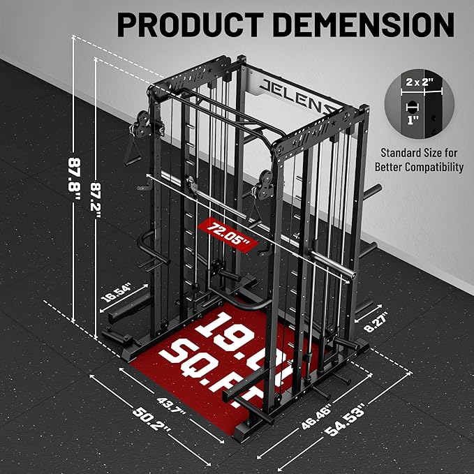 - [Full-Body Workout]: With JELENS Smith machine for home gym, you can exercise your entire body using just one single machine. It's an ideal all in one equipment for squats, pull-ups, bench presses, lat pulldowns, cable flyes, barbell rows, shoulder presses, deadlifts and so on. This fitness machine provides you with a program designed for comprehensive muscle development