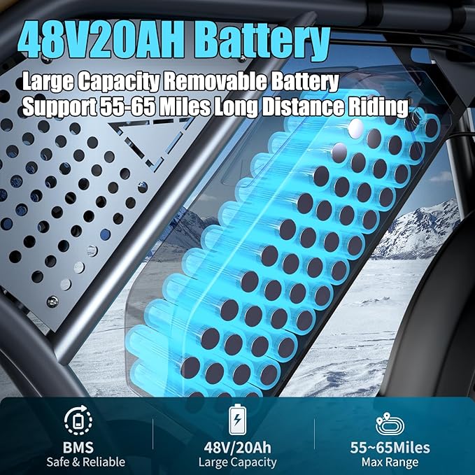 - 【Impressive 75 Miles Range】This ebike is equipped with a large-capacity 48V 20Ah battery, which can travel 75 miles on a single charge (8-10 hours). The detachable 20AH upgraded battery (UL certified) charges in just 4-6 hours and removable design, convenient for you to bring home or office for charging.