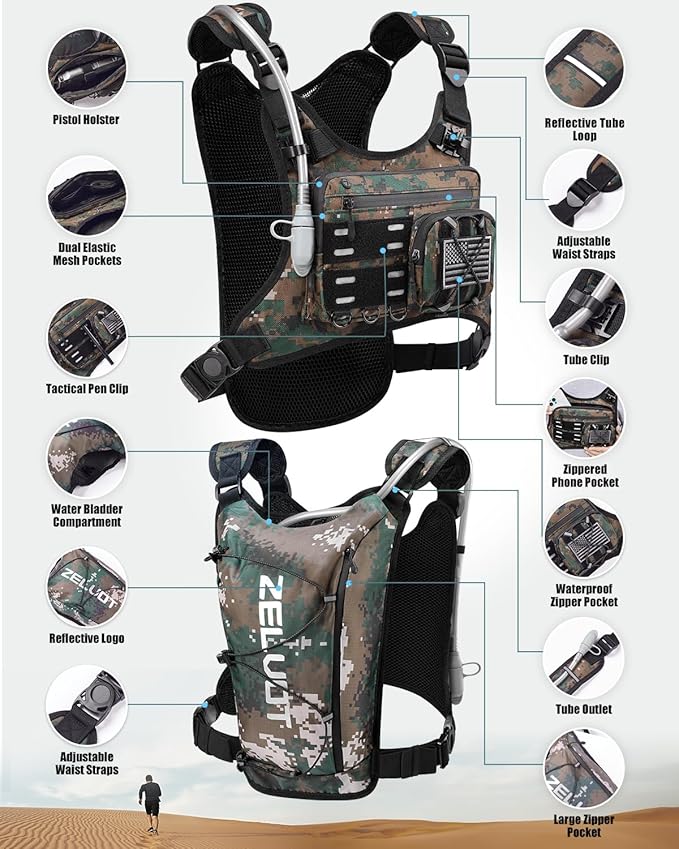 - Plenty of Storage - This chest bag features 3 waterproof zippered front pockets to securely hold essentials like your phone, keys, and energy gels. A detachable, bounce-free pistol holster ensures secure storage for small to mid-sized pistols, while the tactical pen slot keeps emergency gadgets within easy reach. Two large back pockets fit a water bladder, towel, extra clothing.