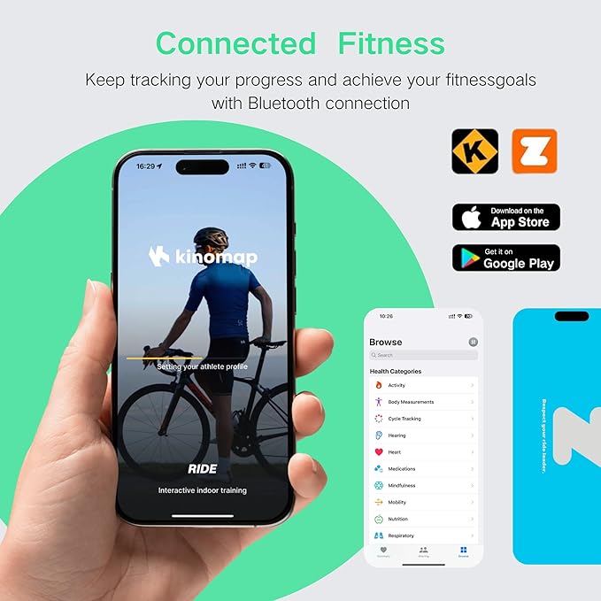 - 【2025 EXERCISE BIKE WITH BLUETOOTH & FITNESS APP】 A stationary connected via Bluetooth, paired with Kinomap or Zwift software, brings a new experience to your home fitness. The software provides diverse cycling scenarios, records training data, and elevate your training to the next level.