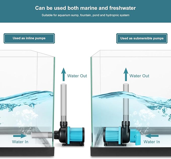 - Wide applicaion and Safty pump: can be used as salt water or fresh water aquarium sump pump, fountain pump,hydroponics pump and waterfall pump;can be used as sumbersible pump and inline pump;the pump comes with smart contoller and DC24V power supply adapter,pump will automatically shut off when the pump run dry or blocked;safty for you and your fish.