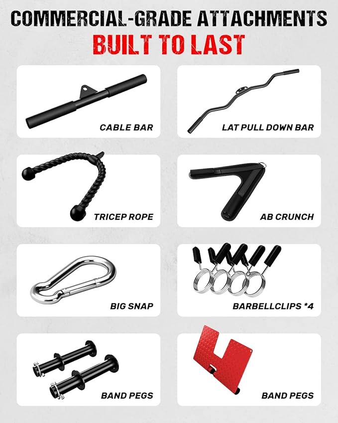 • 【Pro-Grade Attachments Included】: Customize every workout like a pro! Comes ready with essential tools: a Lat Bar for wide back development, a Cable Bar for versatile presses and curls, two band pegs for resistance helping to add versatility, a ab crunch and a tricep rope for core training. Instantly expand your exercise library and target every muscle group with precision.