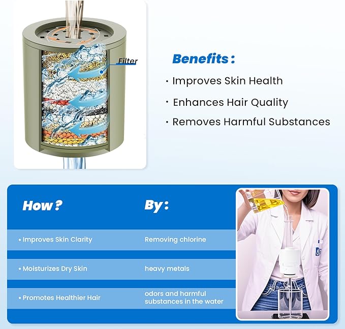 - High Output Water Filtration: Equipped with a high concentration of KDF-55 and other advanced filtration materials, this water filter for shower head effectively removes heavy metals, chlorine, and other harmful substances, helping promote healthier skin and hair.